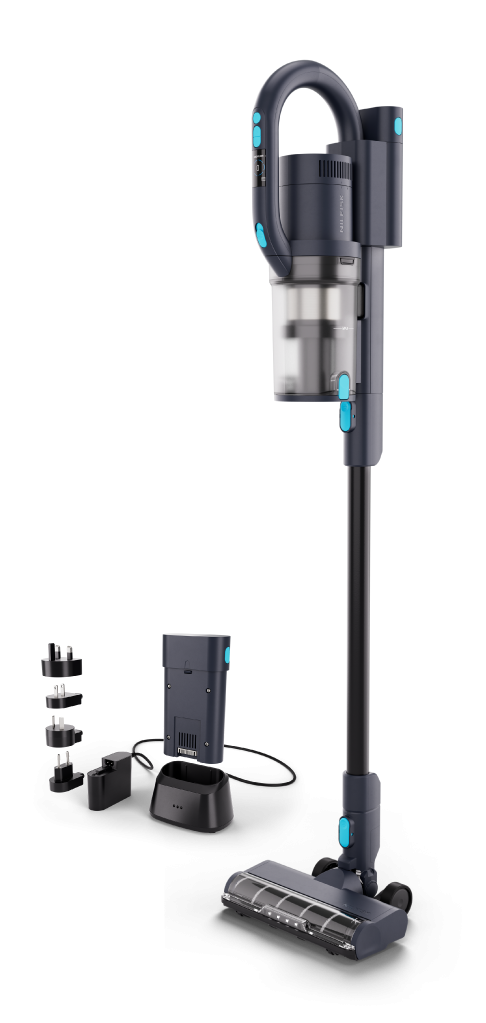 Der VU200 ist einfach zu bedienen, leicht zu entleeren und schnell zu laden. Hellblaue Elemente zeigen intuitiv, wo man ihn bedient. Mithilfe der farbigen Schalter am Griff und des digitalen Displays lassen sich die 6 Saugstufen je nach Bodenart anpassen. Der Wechsel des HEPA-Filters ist werkzeuglos, ebenso wie das Entleeren des Staubbehälters ohne Beutel.