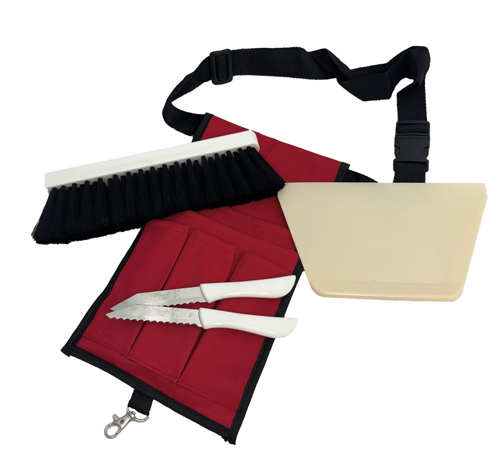 enthält 1 Gürteltasche in rot, 2 Ritzmesser mit weißem Griff, 1 Mehlbesen mit schwarzen Polyesterborsten und 1 Teigschaber in Farbe Elfenbein.