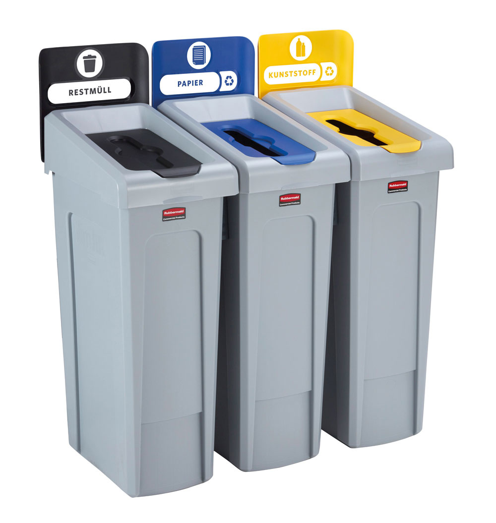 - Sie können zwischen sieben Farben mit beschrifteten Hinweistafeln und vier Deckelarten mit unterschiedlichen Einwurf- Öffnungen wählen. Somit ist eine falsche Mülltrennung beinahe ausgeschlossen.