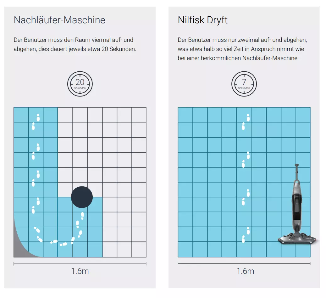 Nilfisk Dryft ist der mühelose Weg zu einer gründlicheren und effizienteren Reinigung. Unsere erste Mikro-Scheuersaugmaschine ist hygienischer als ein Mopp und hat die Größe eines Stielsaugers. Sie reinigt problemlos alle schwer zugänglichen Stellen – überfüllte Räume, schwierige Ecken und Kanten, enge Spalten und um Hindernisse herum. Sie ist der natürliche Nachfolger des Mopps für die heutige Zeit.