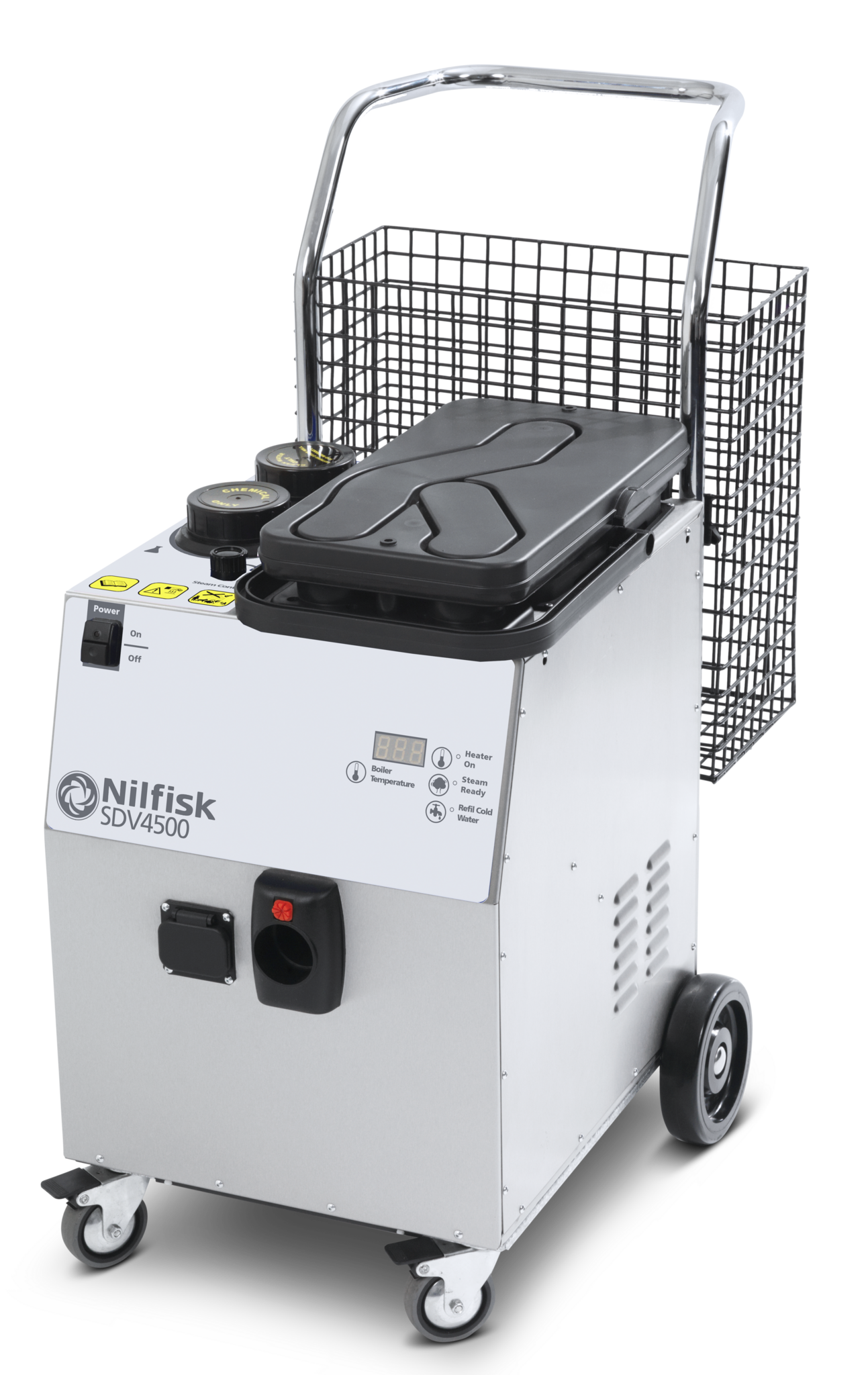 Der Dampfreiniger bietet 4,5 bar Druck, einen 1,8‑l‑Boiler und einen 5‑l‑Wassertank für lange Einsätze. Durch die kontinuierliche Befüllung läuft er bis zu 6 Stunden durchgehend. Arretierbare Vorderräder, Sicherheitsabschaltung und eine robuste, pulverbeschichtete Stahlkonstruktion sorgen für sicheres und langlebiges Arbeiten.